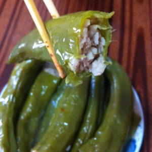 将混合好的马蹄肉馅用筷子慢慢塞满每个青椒