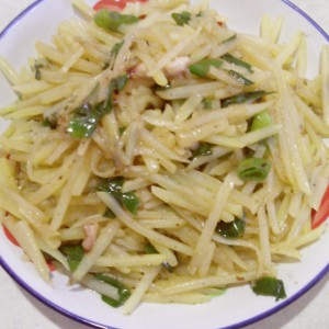 土豆切丝,用凉水泡一下,泡走多余的淀粉,以免炒的时候糊锅,这个都知道啦。锅内加入适量的油