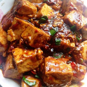 最后就是勾芡,把淀粉用水稀释,然后淋在豆腐上,翻炒一下,然后就可以装盘了。
