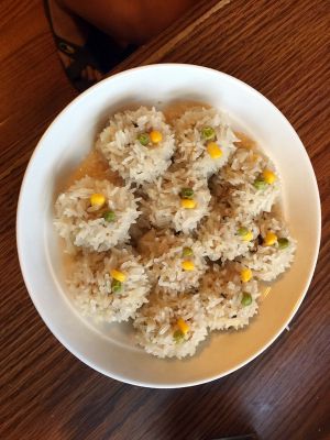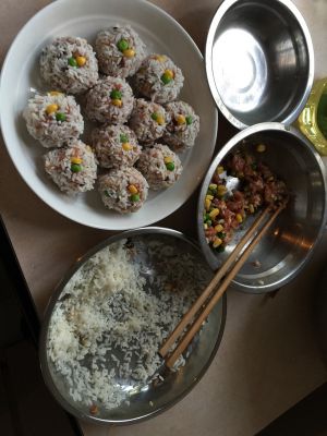 糯米泡好了,馅搓成肉丸再裹成糯米,扎下,进肉里一些