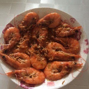 油锅加热后放入葱姜蒜末爆炒出香味,加入腌好的虾(注意!腌虾的调料汁要倒掉),翻炒至虾变红,加入没过虾的量的黄酒,盖上锅盖大火焖半分钟收汁。