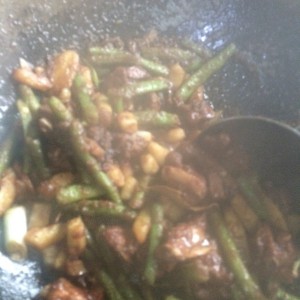 炒大约3分钟倒入土豆豆角放一小勺水!4分钟后起锅
