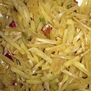 加入土豆丝翻炒,可以点一滴老抽着色,根据个人口味加入适量香醋,继续翻炒。