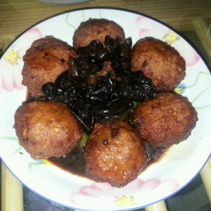 锅中不加油烧热放入炸好的狮子头,泡发的黑木耳,倒入海鲜酱油,少许料酒,冰糖,几滴醋,翻炒均匀,添刚刚没过狮子头多的水,大火烧开,小火慢炖,最后大火稍微收汁即可出锅,小白菜苗焯水摆盘装饰。