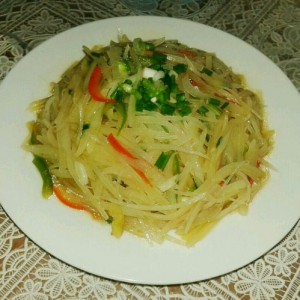 热油,土豆丝下锅,翻炒一下立即加醋,不然就不脆了,大火炒,然后加少许水,放彩椒丝,同炒,调料,撒香葱,即可剩盘