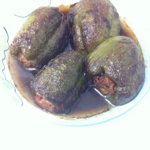 青椒洗干净,青椒蒂往里按进去,取出青椒籽,沥干水份。表面的水擦干净。