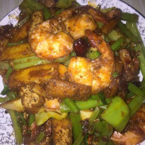 将洗干净的大虾放在盆里放料酒和淀粉腌制三分钟,然后开锅炒大虾,炒三分钟,捞出来,将切好的蒜苗姜丝放进去,炒出香味,然后放入辅料,大虾,一起爆炒3分钟后就成功啦。