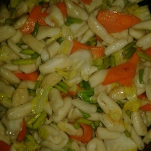 8.锅里放油,把葱蒜先放入锅里,再放入切好的葫萝卜,蒜台,回子白,炒几分钟后,再把煮好的猫耳朵一起下锅翻炒几下,就可以出锅啦