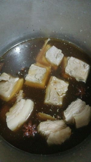 肉块连同八角,花椒一起捞出放入高压锅,加入桂皮,香叶,姜,生抽,料酒,糖,黄豆酱,加水没过肉块,高压锅压35分钟