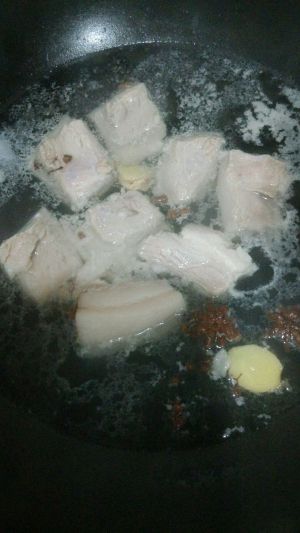 五花肉洗净切大块,加姜,花椒,八角入沸水焯一下
