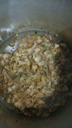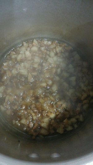 捞出八角等全部卤料,只留卤汁,把肉丁倒入,大火收汁