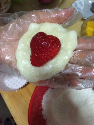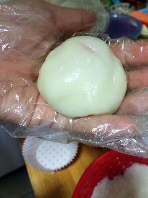 将放凉的糯米团大致分成60g左右的小团,然后压扁,像包汤圆那样包入馅料。