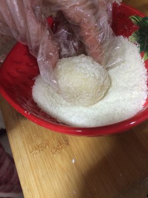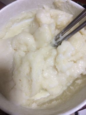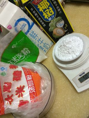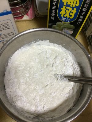 先将糯米粉、玉米淀粉、椰奶、牛奶、糖粉、玉米油拌匀。