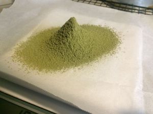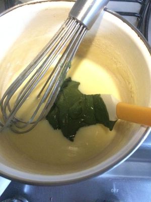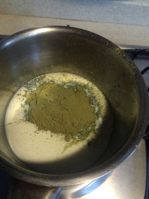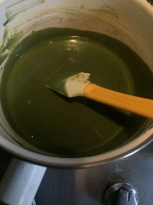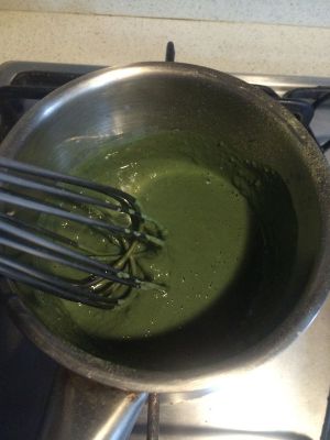 材料A中50ml的牛奶放入小奶锅中煮到温热,倒入抹茶粉;