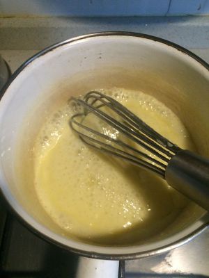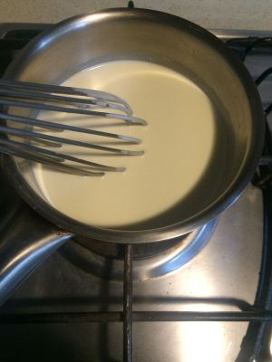 材料B的150ml牛奶加淡奶油,细砂糖混合,用较深的容器小火加热;