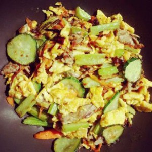 备菜:西芹切段,黄瓜切片(当然菱形更好看,我嫌麻烦),胡萝卜切片,鸡蛋打散,葱姜蒜切末(少量借味即可)。