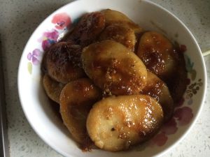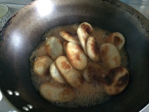 锅里加水加糖熬汁,放入煎好的米粉饼