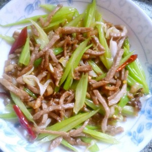 锅中加入适量油,油热后放入肉丝炒至变色,加入准备好的菜,炒两分钟,加入适量盐和味精。