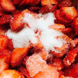 将泡好洗净的草莓沥干后,切片撒入白糖和柠檬汁。用小木铲将白砂糖、柠檬汁、草莓混合搅拌。