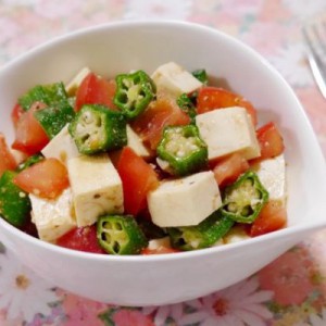 秋葵盐水烫一分钟冷水冷却后切丁,豆腐,番茄同样切丁。(豆腐最好用老豆腐,不易碎)
