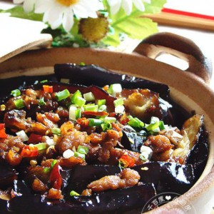 倒入肉末(提前用料酒和盐腌制一会儿)炒匀至5成熟,倒入茄子。