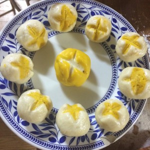 发好面一个面团个一小剂把黄的包在白的里面然后用刀划十字刀就可以上蒸锅了,蒸15分左右就可以了,想要什么颜色的花样都可以换