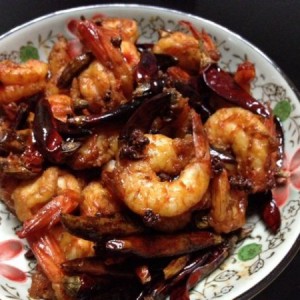 花椒,干辣椒用油爆香,把虾放下一起大火炒至变色,加少许生抽,起锅~