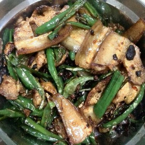 放入辣椒。翻炒五分钟。加入老抽,灼色。