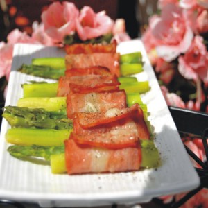 卷起芦笋,用牙签固定好。将将固定好的培根芦笋串放入烤盘中,烤盘里垫上一张锡纸