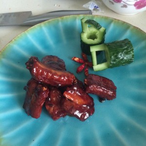 之前做没拍图。第一步炒糖色 锅里加一点油 下白糖 等到糖融化变成黄褐色 下排骨和姜葱。