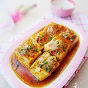 把肉糜酿入豆腐中,平底锅烧热放入适量油,把酿好的豆腐露肉一面朝下煎黄后翻面稍煎一下。