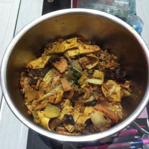 先放肉类炒至入味,但不要炒老,然后放干豆腐和平菇继续炒,感觉炒匀后加入其它所有菜类,由于菜都綽过水,所以把水炒出去就可以出锅了,根据个人口味加盐和味精,我口重所以放完一袋底料后又加了半勺盐和味精