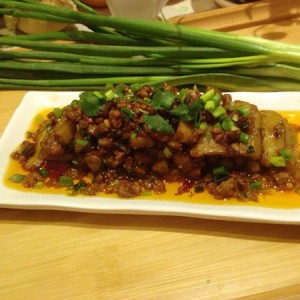 把刚才炸茄子的油倒出留一点底油,八成热,入肉末炒熟。下一半蒜末和葱花爆香。
