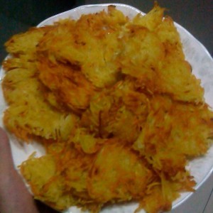 把土豆切成丝状,加鸡蛋,做成饼状,