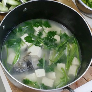 倒入清水后放进4片姜用中火煮开,加入豆腐块(豆腐买回家时选用开水焯一下去醒捞起切小方块用冷水泡着备用)转小火煮,煮至变白色后放入适量香菜和调味盐煮1分钟就可以了。