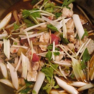 锅中放入400g菜油煎好后就放郫县豆瓣和油泼辣子再加入切好的葱丝姜丝和切好的辣椒段及洋葱,煎好后锅中加入1000g水待水烧开后加入事先用盐腌好的鱼(鱼用盐腌20钟也可以加点料酒去腥味,待要下锅煮的时候再在加淀粉和好)煮5分钟就可以出过了