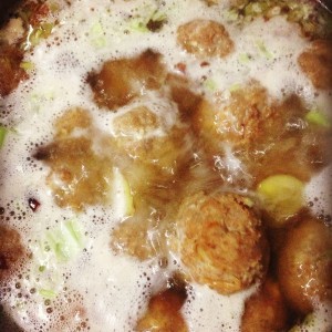 少许油,放入葱姜花椒茴香鸡精,水没过丸子,煮透即可
