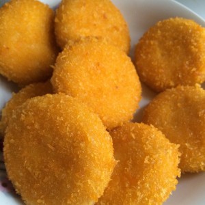 刷上鸡蛋清再裹上面包糠,因为没有拍照用了上次做的照片,注意上次是白面包糠,炸出来要不好看,亲们注意可以的话尽量用黄糠