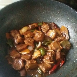 熬制水分不多的时候加入青辣椒和洋葱,如果不加就忽略这一步奏。