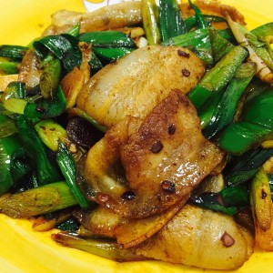 爆炒切片的五花肉,再加入姜片、蒜、豆瓣酱、糖、生抽、蒜苗、辣椒,装盘。