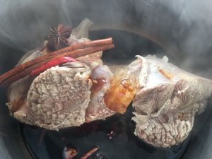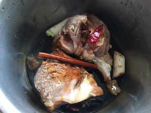 牛腱洗净去掉看着不顺眼的筋膜,凉水下锅煮出血沫捞出,牛腱煮之前用牙签戳无数个小洞,入压力锅内锅放入所有调味料。