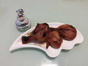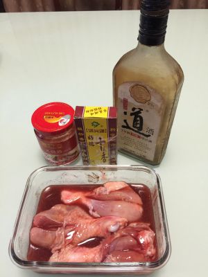 将鸡腿放在密封的玻璃盒内,加入叉烧酱、十三香、盐和黄酒盖过鸡腿