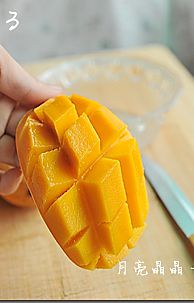 用刀尖将果肉划十字(网格状),刀痕深度贴近芒果皮。