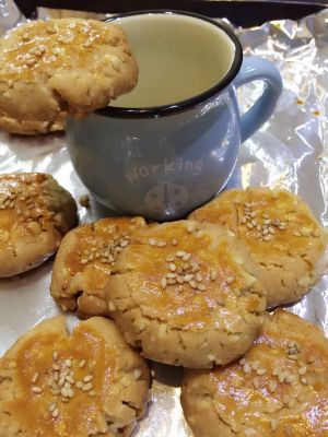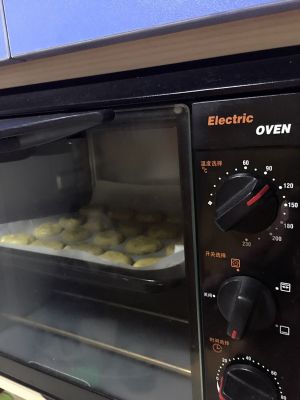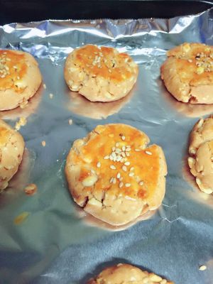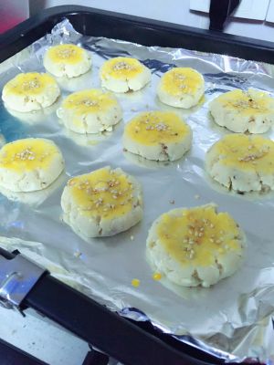 将搅拌均匀的面团,揉成一个个小圆球,然后用大拇指按压成扁圆型,放入预热好的烤箱,小火100度烤5分钟。拿出表面刷上鸡蛋黄液,撒上芝麻。