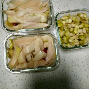 冬天用凉开水一大碗,老姜5块,大蒜3个,干红辣椒10颗,干花椒一小撮,盐50克一起放入坛中,用手搅拌把盐搅化,加入萝卜皮,
