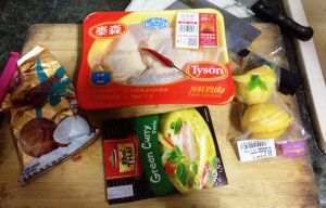 有平底锅选用平底不沾锅煎鸡块。不需要放油,放油会使得后续汤头过油。煎的鸡块变色后,放入绿咖喱酱50G,翻炒。