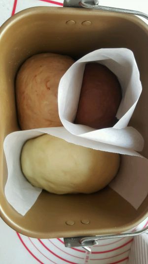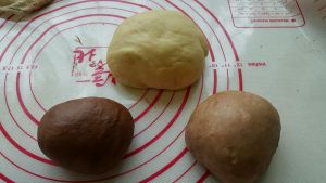 把面团取出分成三份,其中两份分别加入不同量的可可粉,揉均匀。我加了一点点牛奶方便揉均匀,一点点就好哦~可以根据面团实际情况调整。