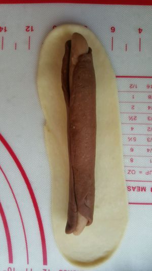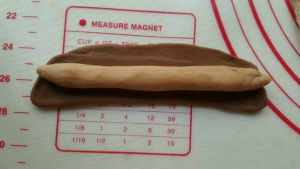 取一份深色面团擀成牛舌状,把浅色面团搓长,包在里面。