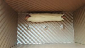 把包好的面团再搓一下,比吐司盒略短,然后放进去。