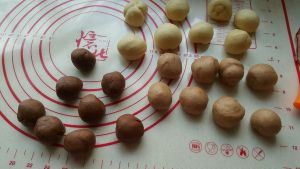 取出面团轻拍排气,并把每个色分成八份滚圆,用布盖着松弛15分钟。